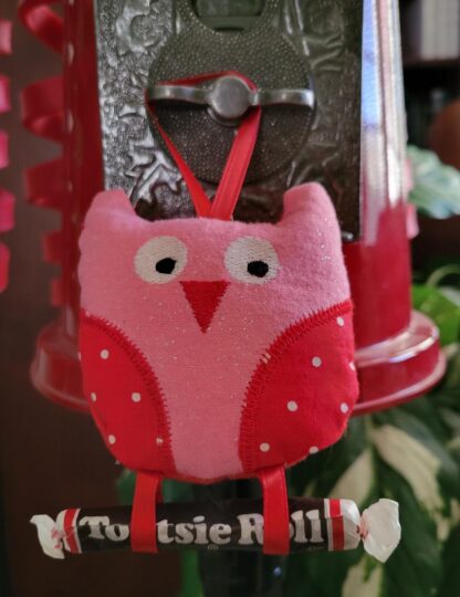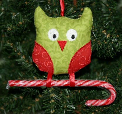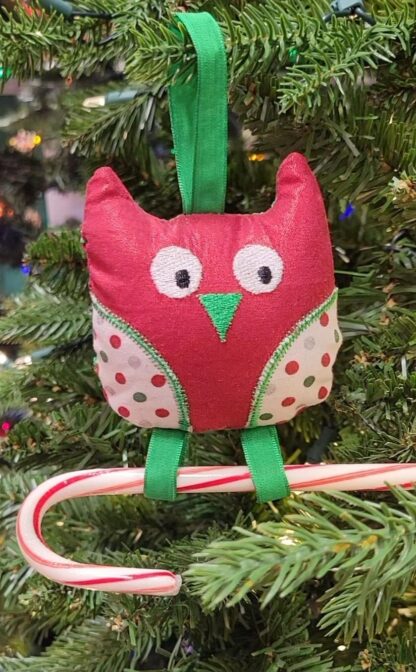 This is a machine embroidery in the hoop project for an owl stuffed holiday ornament. These adorable owls can hold candy canes, money, pixie stix, pencils etc. in their feet. These owls also are great as gift tags, back to school, room decoration or for decorations for any other holiday. Great for using up scraps and easy to personalize.